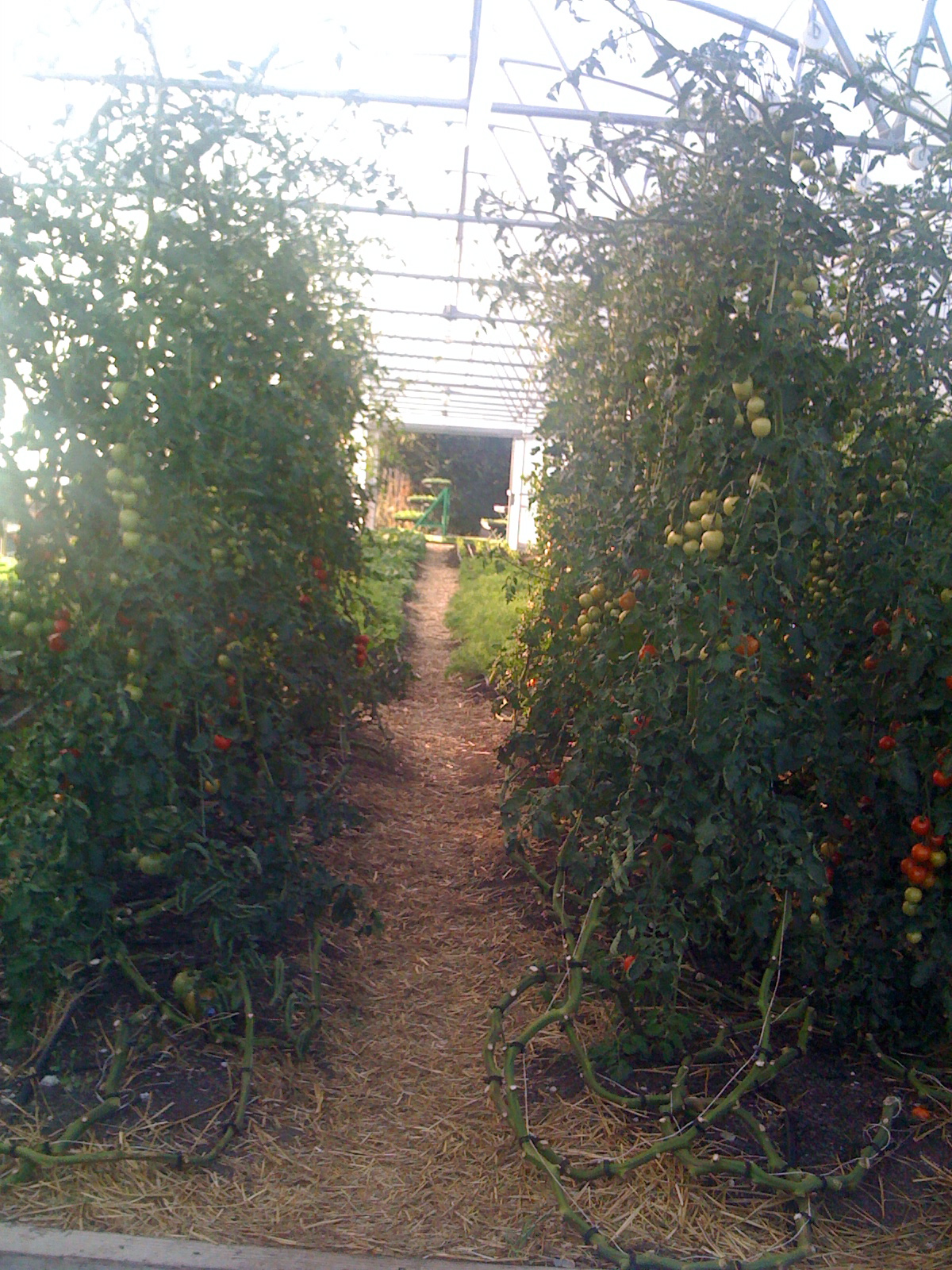 In the greenhouse, they had tomatoes staked up and growing like vines, held by twine and clips. Those snaky things at the bottom of the picture are vines that had been pruned, and probably would stand 12′-15′ tall if righted.