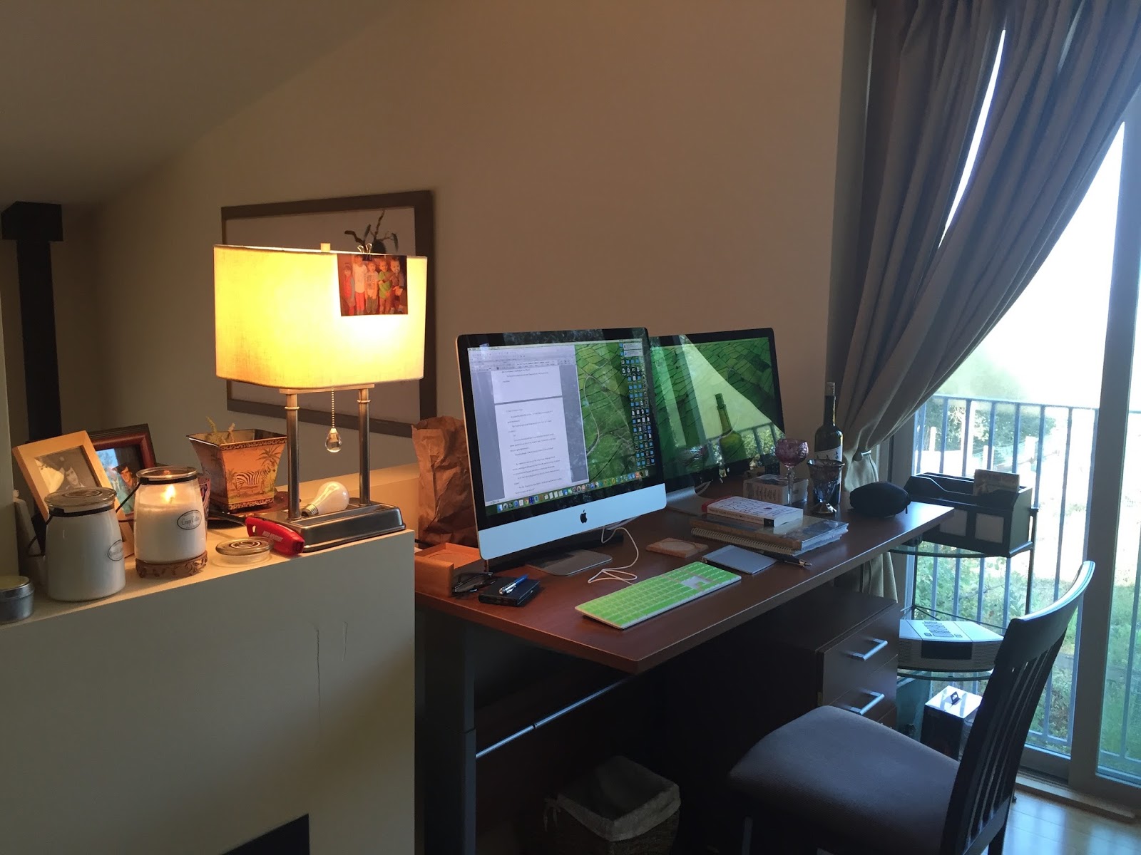 So, for now, I purchased another computer and Thunderbolt Screen, and when I write, I sit at my adjustable desk. I can stand, or sit on the stool. I light my candles, and inspiration does come. I usually have two sleeping Dobermans at my feet, vying for attention, so I have a jar of cookies nearby to reward their loyalty. I don’t pay bills or even do anything email-wise or business-wise on that computer. I don’t even write these blogs there. It was expensive to do this, but ever since, I have found it to be liberating. I’ve written poetry here. Sometimes I do a little research for my stories, but everything I do is related to a current book I’m working on.